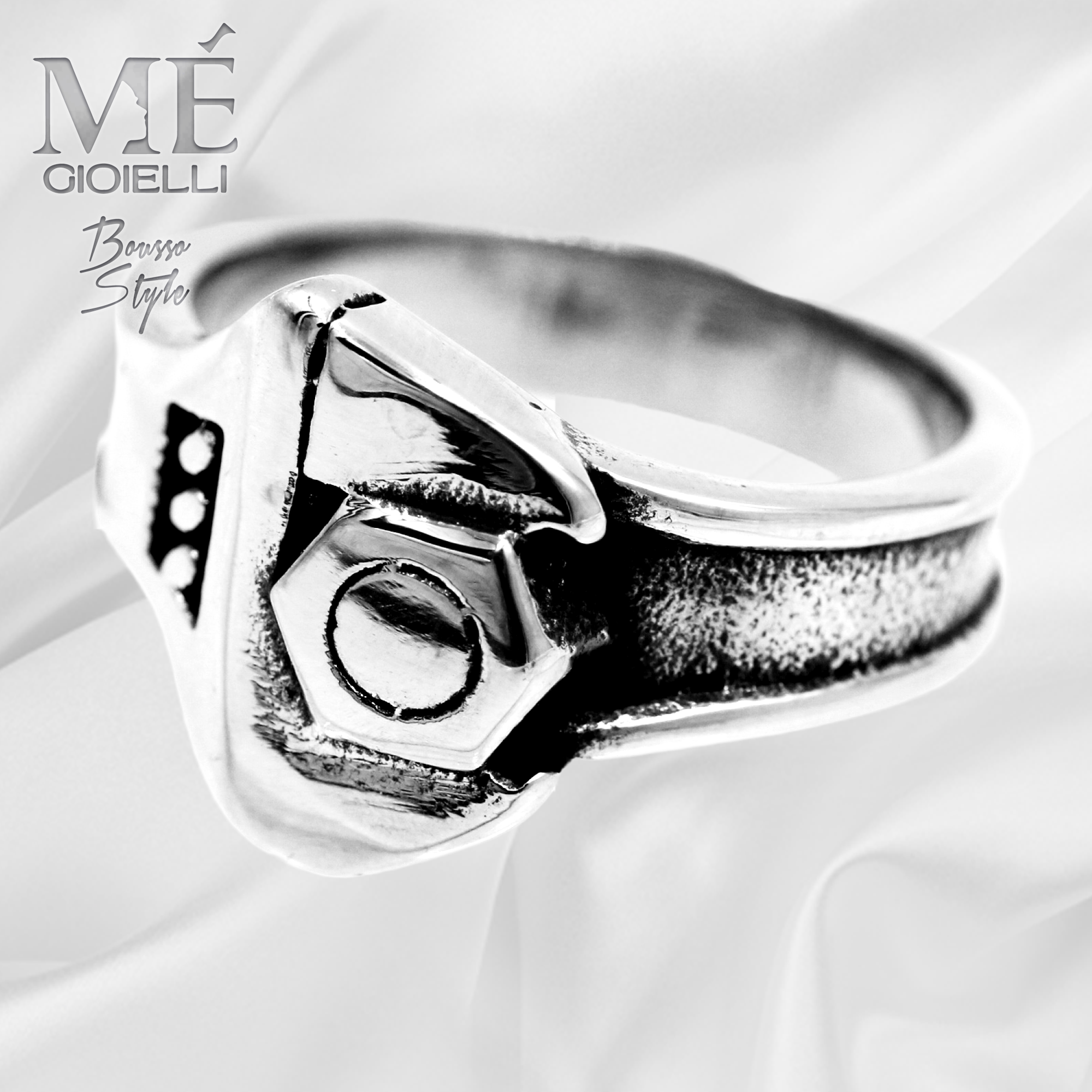 L’Anello Chiave Inglese è completamente realizzato a mano in acciaio anallergico con la tecnica della cera persa FREE NICHEL e bruniture.