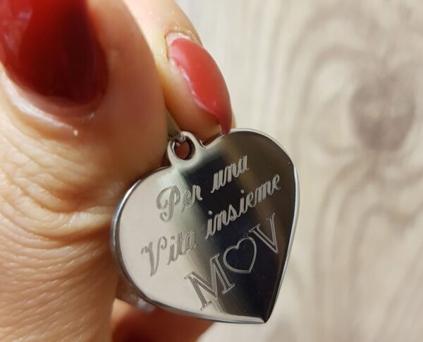Ciondolo cuore in acciaio chirurgico anallergico senza nichel, con la fra se “Per una Vita Insieme” e le due iniziali.