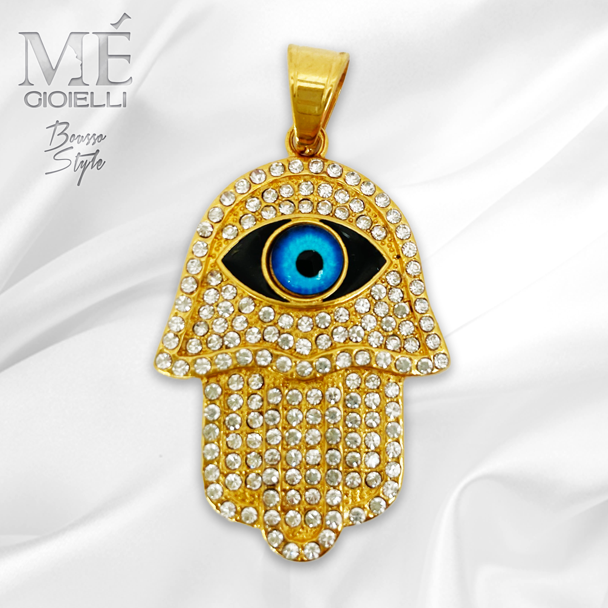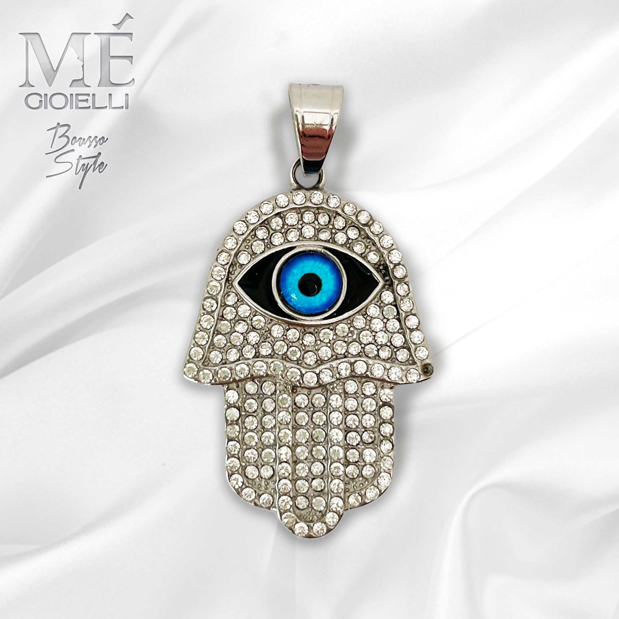 Ciondolo in Acciaio FREE NICHEL realizzato a mano con incastonati un occhio e microswarowsky a 77 facce facce che la rende preziosa e unica.