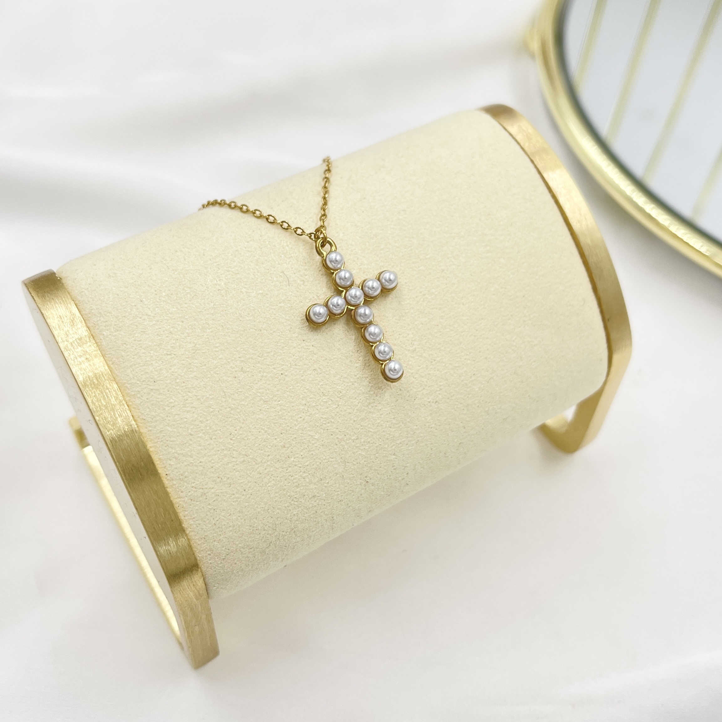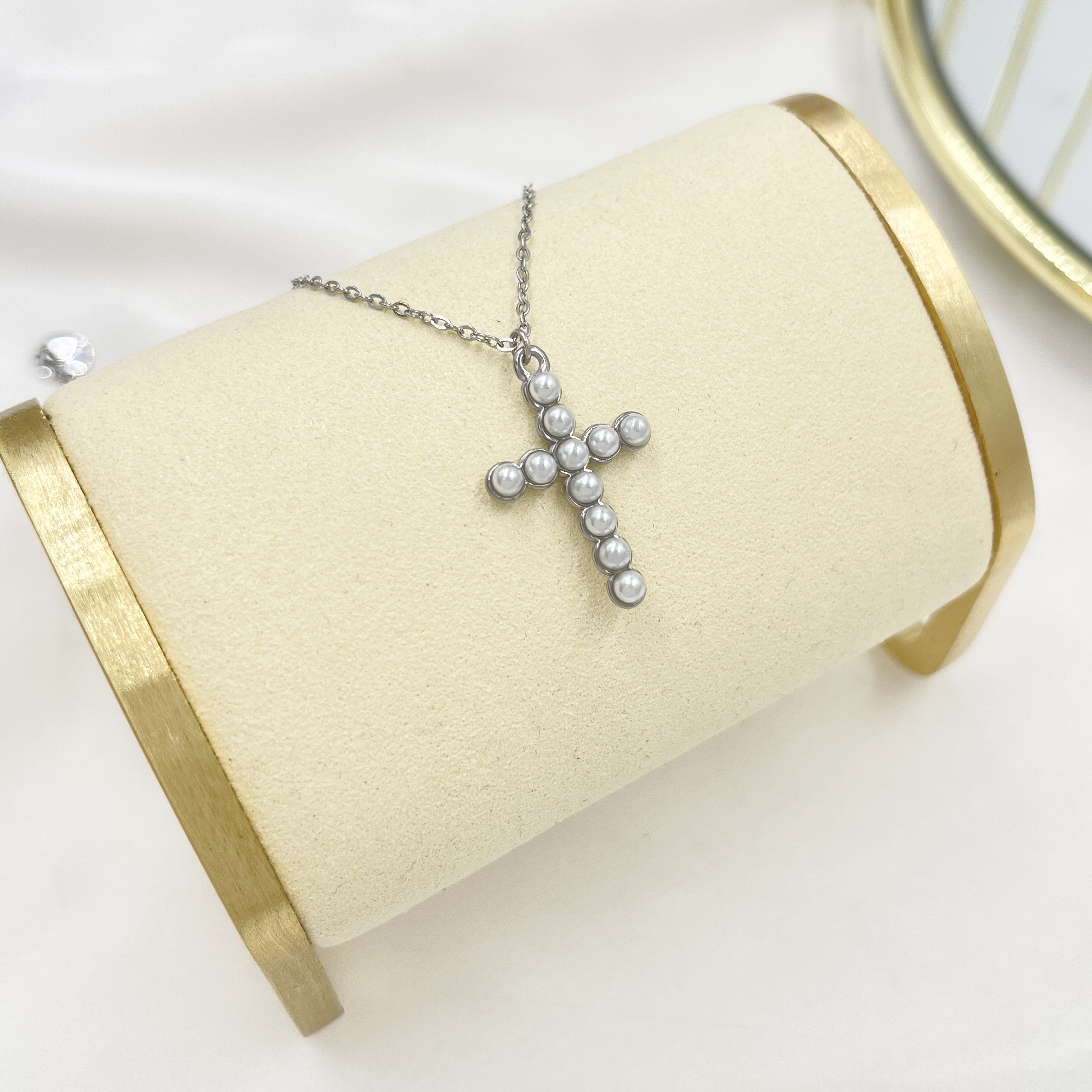 La Collana Croce Perline in Acciaio free nichel e di misura 45 cm + 5 cm di prolunga per poterla regolare in base alla misura del collo.