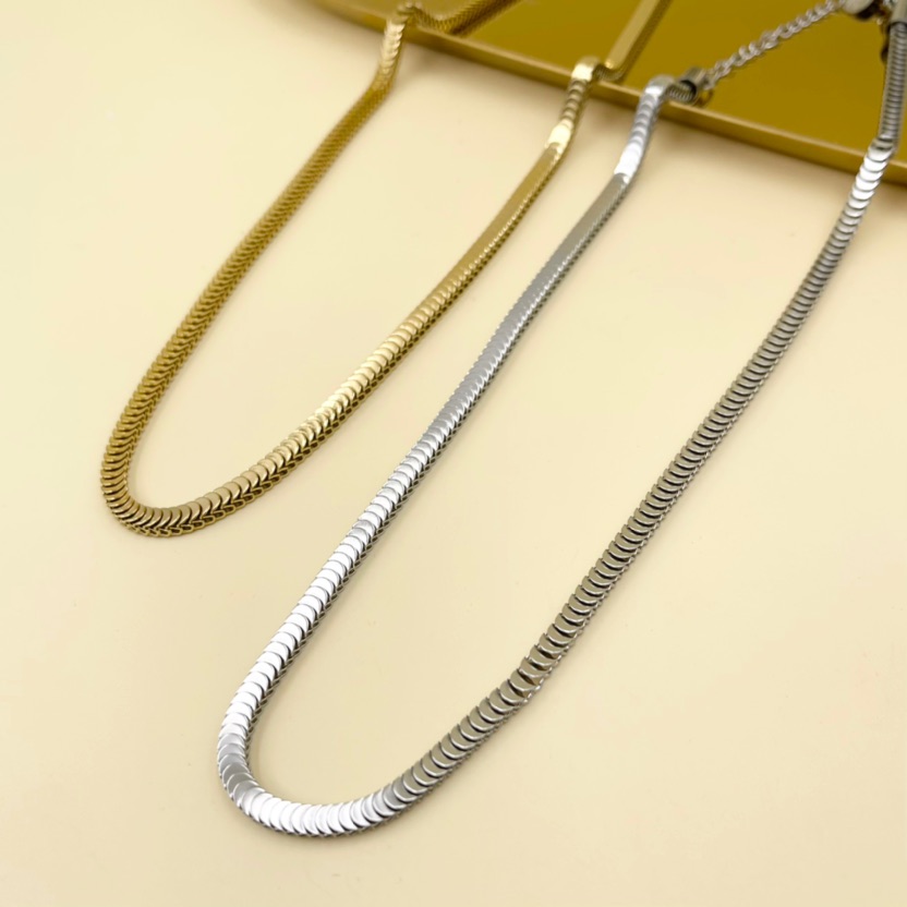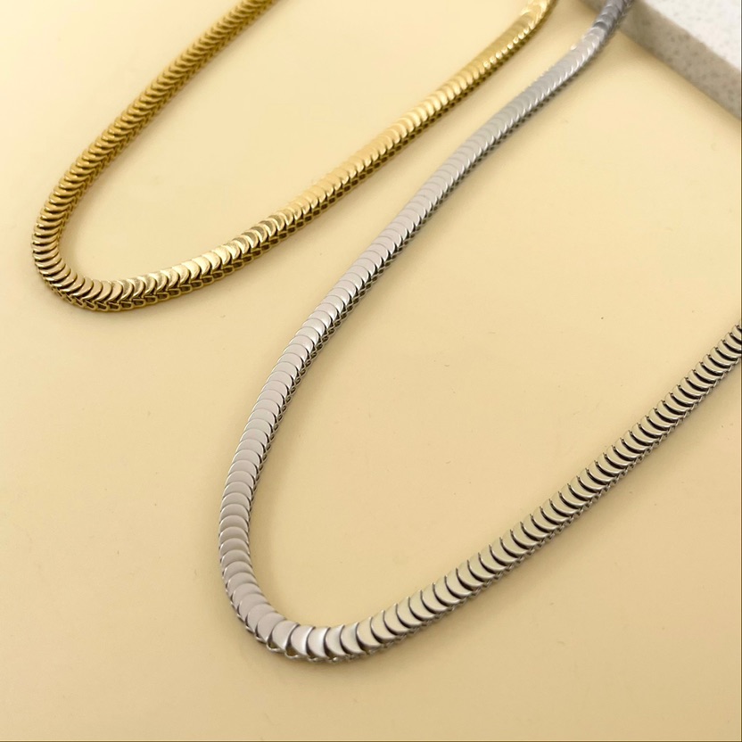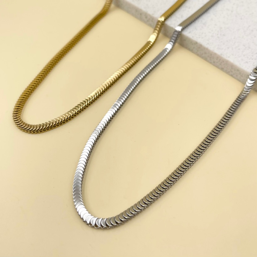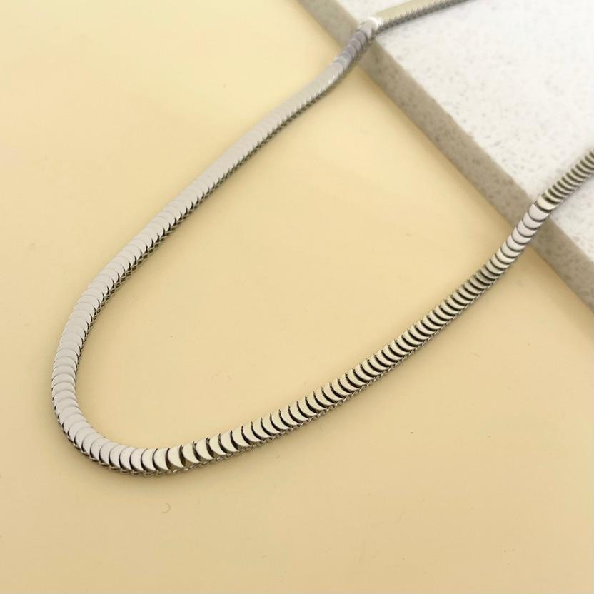 L’acciaio lucido crea un filo sfavillante che decora elegantemente il collo.